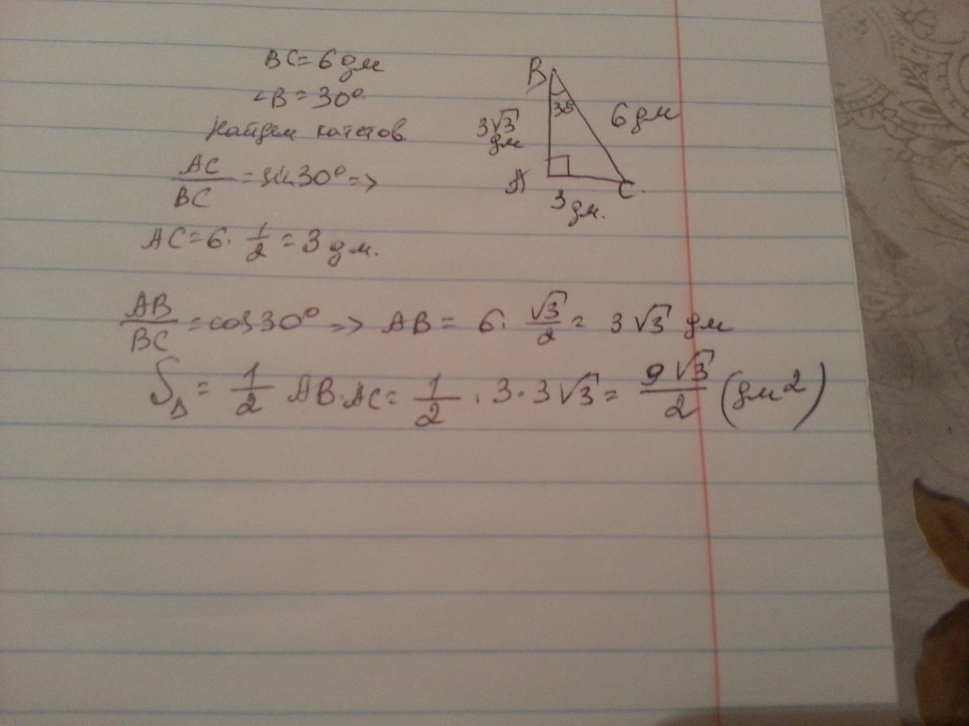 Гипотенуза прямоугольного треугольника равна 6 дм, а один из острых углов-30 градусов. Найдите площадь треугольника.