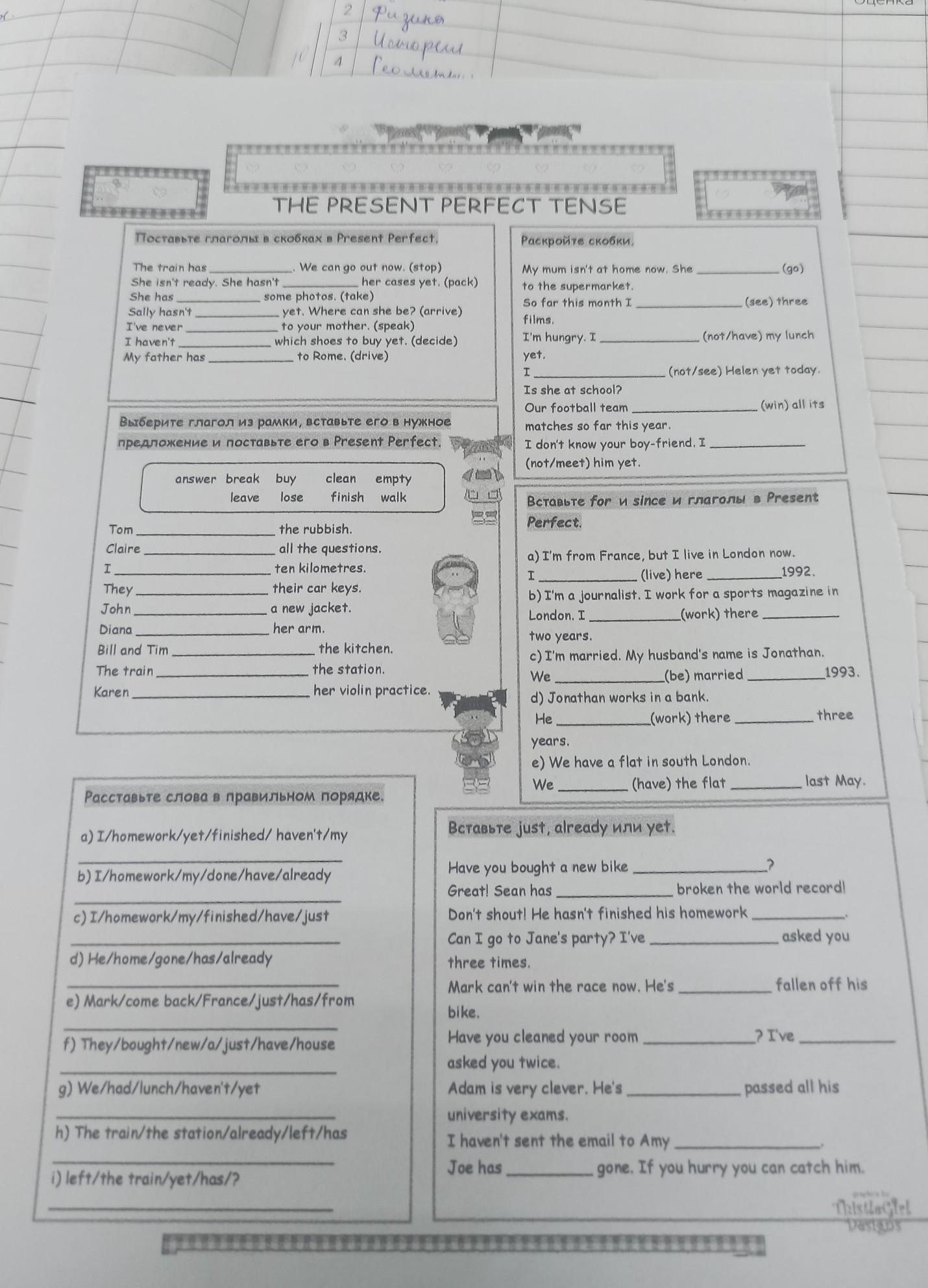 решите,даю 100 балловTHE PRESENT PERFECT TENSE Поставьте глаголы в скобках в Present Perfect. Раскройте скобки. The train has We can go out now. (stop) She isn't ready. She hasn't her cases yet. (pack) She has some photos. (take) Sally hasn't yet. Where can she be? (arrive) I've never to your mother. (speak) I haven't which shoes to buy yet. (decide) My father has to Rome. (drive) My mum isn't at home now. She (go) to the supermarket. So far this month I (see) three films. I'm hungry. I (not/have) my lunch yet. I (not/see) Helen yet today. Is she at school? Our football team (win) all its matches so far this year. I don't know your boy-friend. I (not/meet) him yet. Выберите глагол из рамки, вставьте его в нужное предложение и поставьте его в Present Perfect. answer break buy leave lose clean finish empty walk Вставьте fоr и ѕinсе и глаголы в Present Perfect Tom Claire I They John Diana Bill and Tim The train Karen the rubbish. all the questions. ten kilometres. their car keys. a new jacket her arm. the kitchen. the station. her violin practice. a) I'm from France, but I live in London now. I (live) here_ 1992 b) I'm a journalist. I work for a sports magazine in London. I _(work) there two years. c) I'm married. My husband's name is Jonathan We (be) married 1993 d) Jonathan works in a bank. He (work) there three years. e) We have a flat in south London. (have) the flat last May. We Расставьте слова в правильном порядке. a) I/homework/yet/finished/ haven't/my Вставьте јuѕt, аlrеаdу или уеt. b) I/homework/my/done/have/already c) I/homework/my/finished/have/just asked you d) He/home/gone/has/already e) Mark/come back/France/just/has/from Have you bought a new bike Great! Sean has broken the world record! Don't shout! He hasn't finished his homework Can I go to Jane's party? I've three times Mark can't win the race now. He's fallen off his bike. Have you cleaned your room ? I've asked you twice. Adam is very clever. He's passed all his university exams. I haven't sent the email to Amy Joe has gone. If you hurry you can catch him. f) They/bought/new/a/just/have/house g) We/had/lunch/haven't/yet h) The train/the station/already/left/has 1) left/the train/yet/has/? Thistlegled DESTED