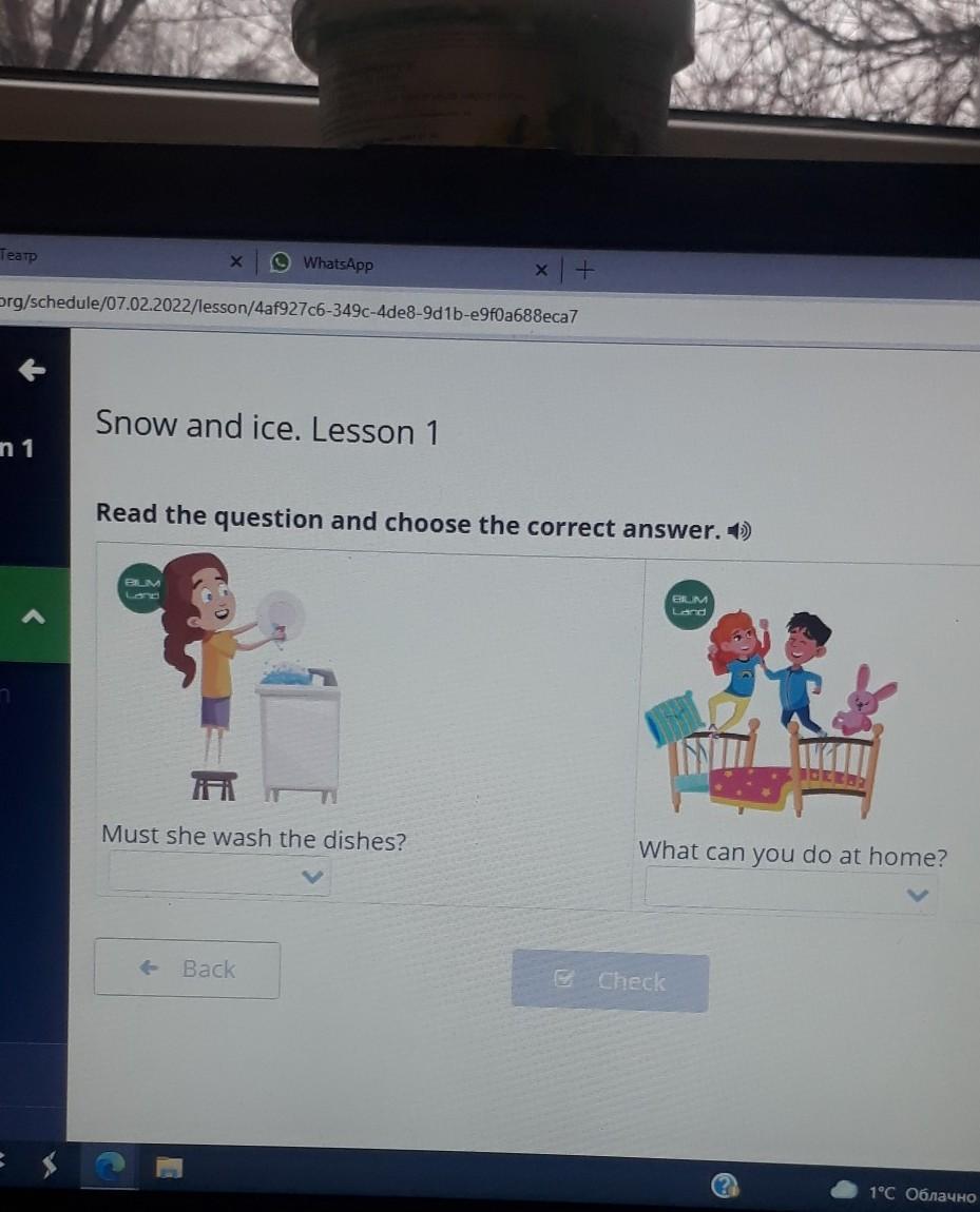 Snow and ice. Lesson 1 Read the question and choose the correct answer. 1) Erபயர் Land T Must she wash the dishes? What can you do at home?