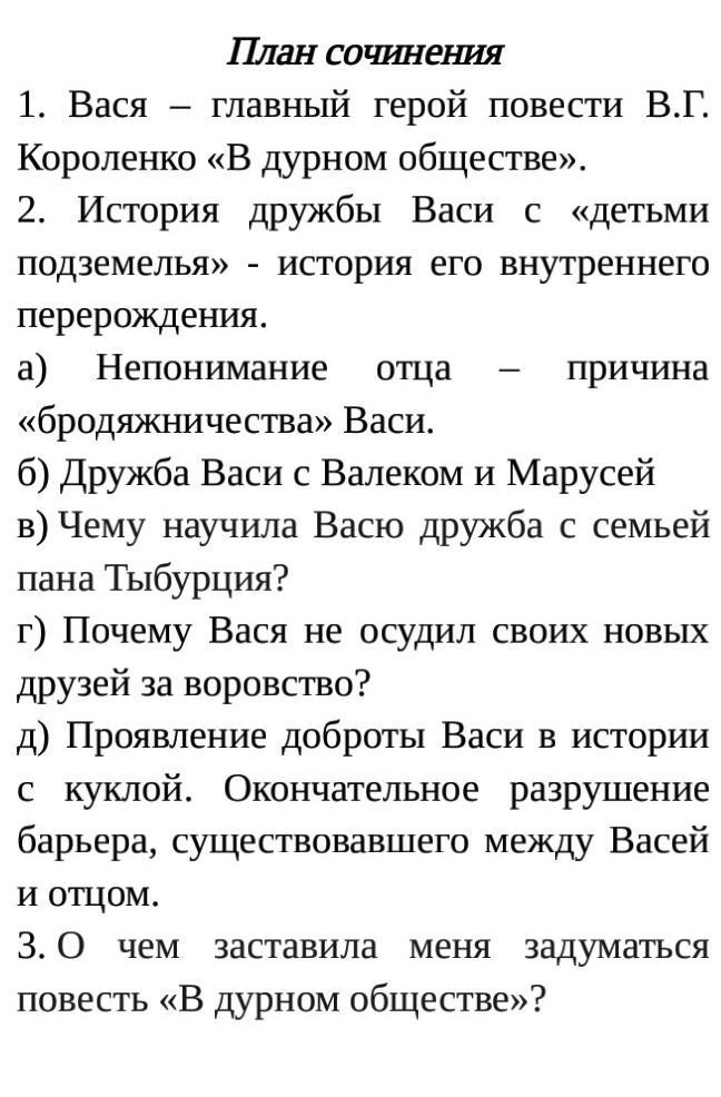 обществе" рассказывается о трогательной дружбе троих детей Васи, Валека и Маруси. Само - повествование также ведется от лица ребенка. Рассказчик и главный герой повести - мальчик Вася, сын местного судьи. Несмотря на то, что происходит Вася из зажиточной семьи, он заводит дружбу с двумя нищими ребятишками, живущими в заброшенной часовне.