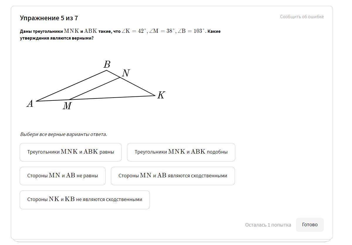 Ответ:Треугольники подобны, Стороны AB и MN не равны, но являются сходственными