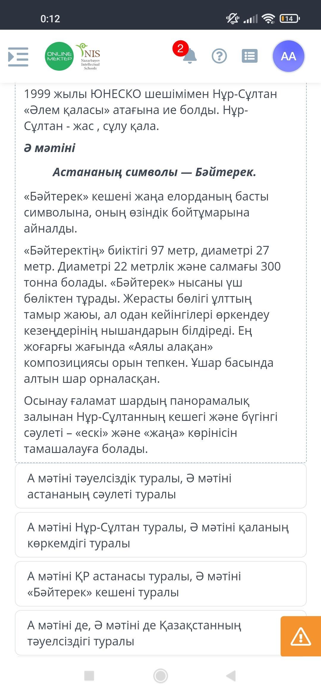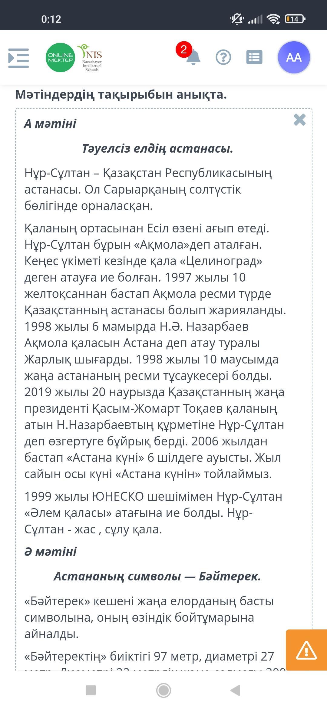 первый текст про столицу Республики Казахстан, второй про Байтерек