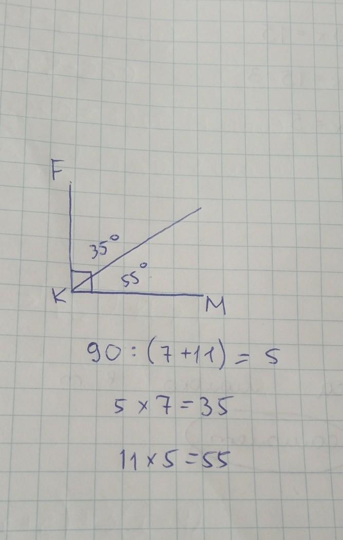 Начертите прямой угол FKM и проведите луч KP так, чтобы градусные меры углов FKP и MKP относились как 7:11