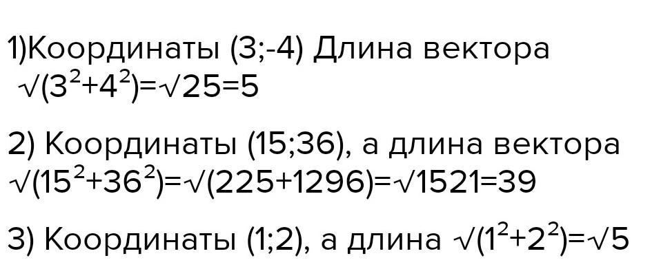 2) Координаты (15;36),а длина вектора √(15*2*+36*2*)=√(225+1296=√1521=39