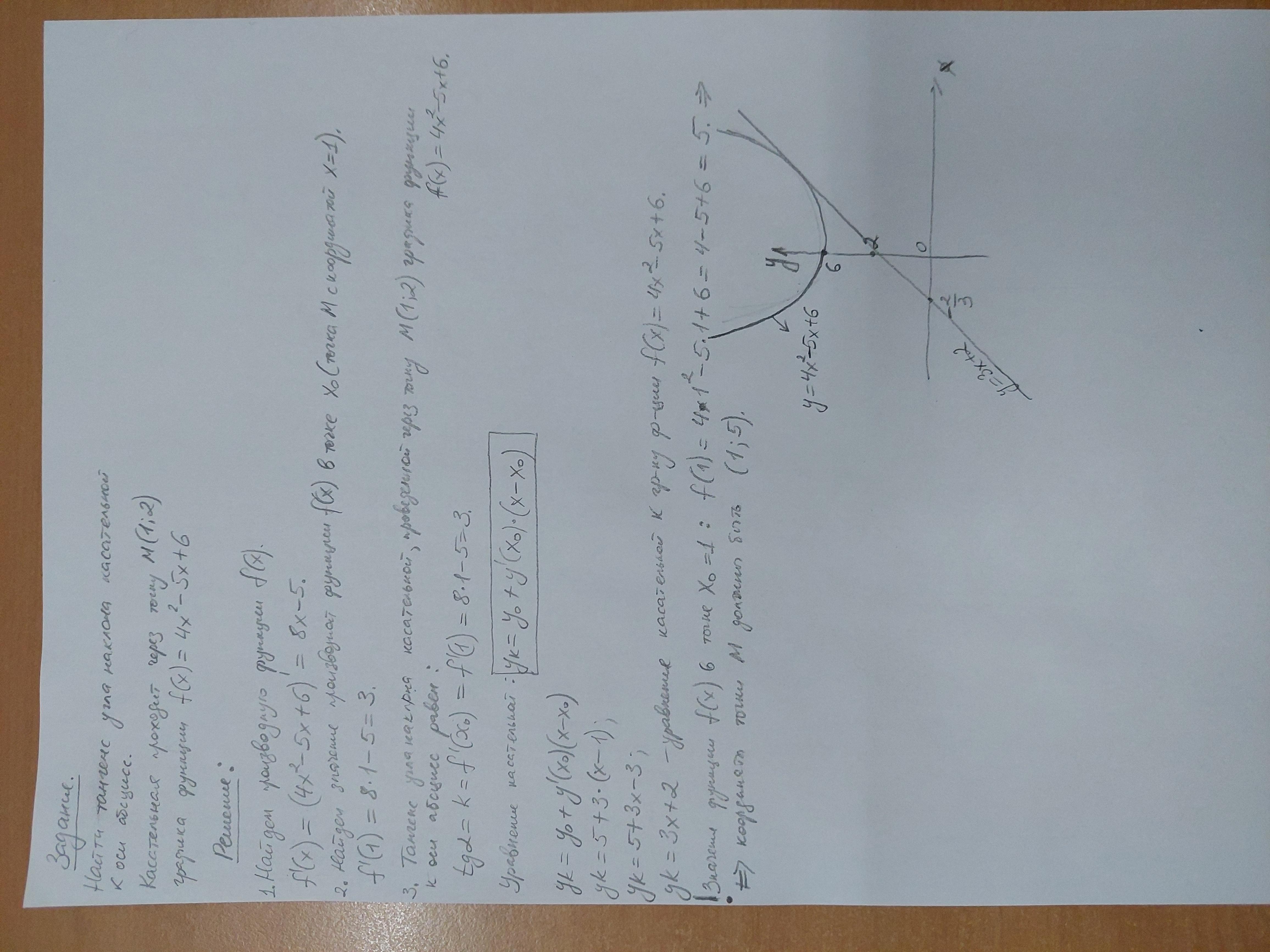 Найти тангенс угла наклона к оси абсцисс касательной, проходящей через данную точку М(1;2) графика функции f(x)=4x^2 - 5x+6.