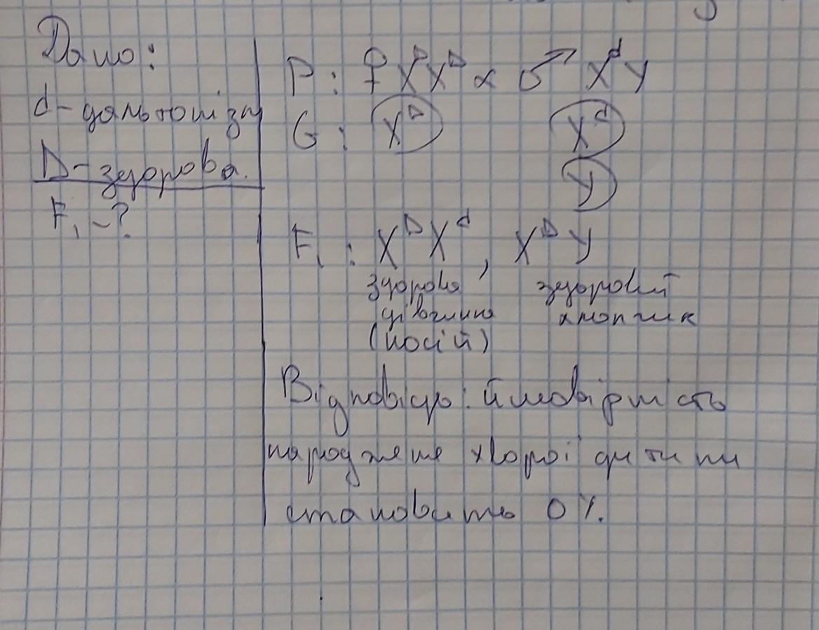 Рецесивний ген дальтонізму перебуває в Х -хромосомі. Чоловік хворіє на дальтонізм, а дружина та її батьки розрізняють кольори нормально. Яка ймовірність народження в подружжя хворої дитини?