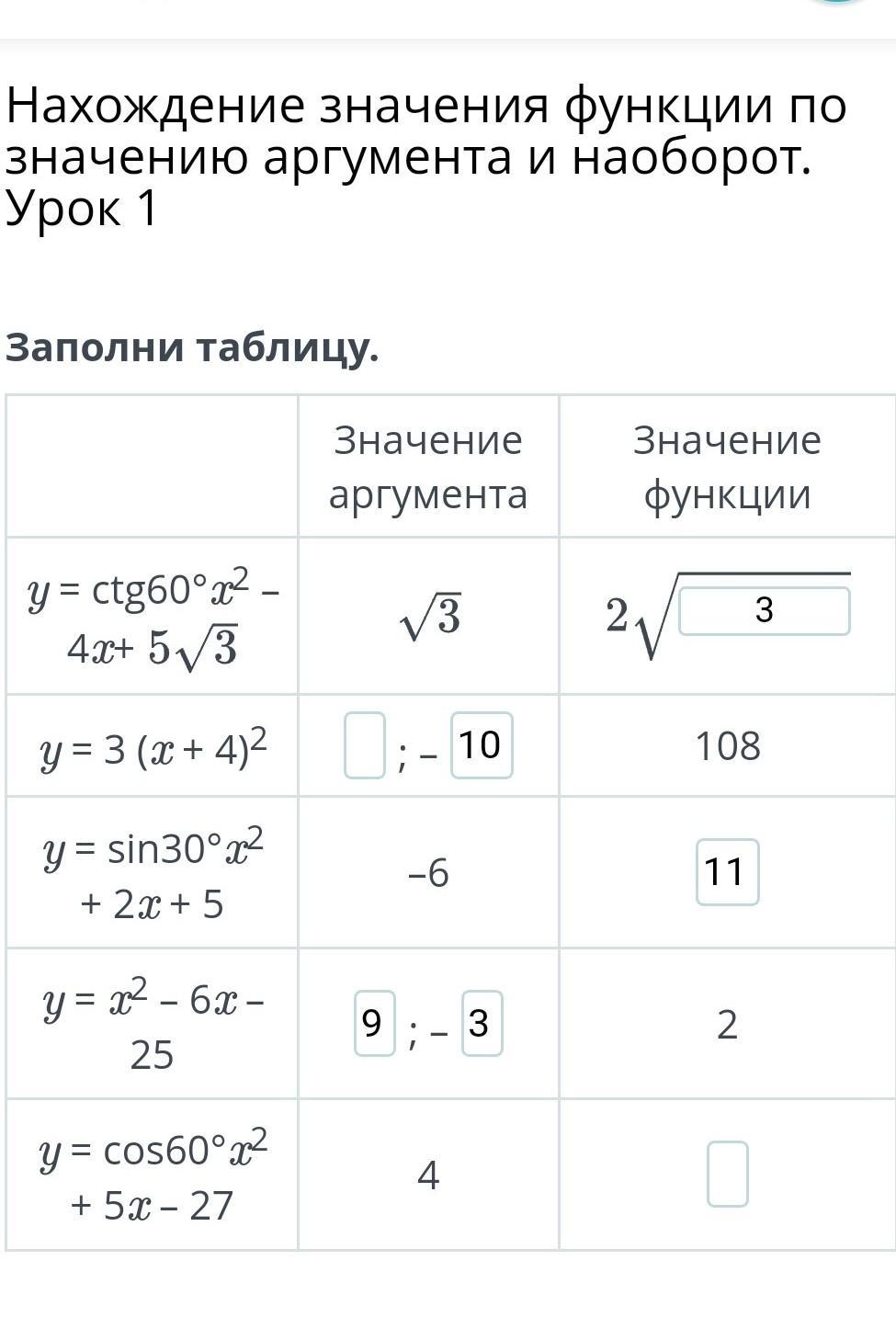 5)аргумент х=4, у=1/2*4²+5*4-27=8+20-27=1