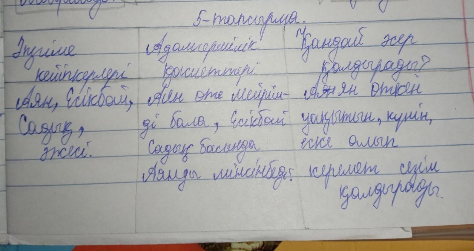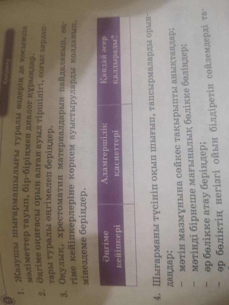 . Оқулық, хрестоматия материалдарын пайдаланып, әңгіме кейіпкерлеріне көркем ауыстыруларды қолданып, мінездеме беріндер. Әңгіме кейіпкері Адамгершілік қасиеттері Қандай әсер калдырады?
