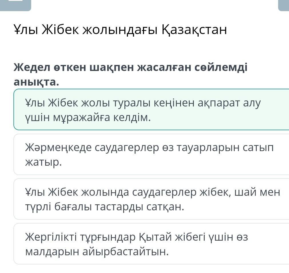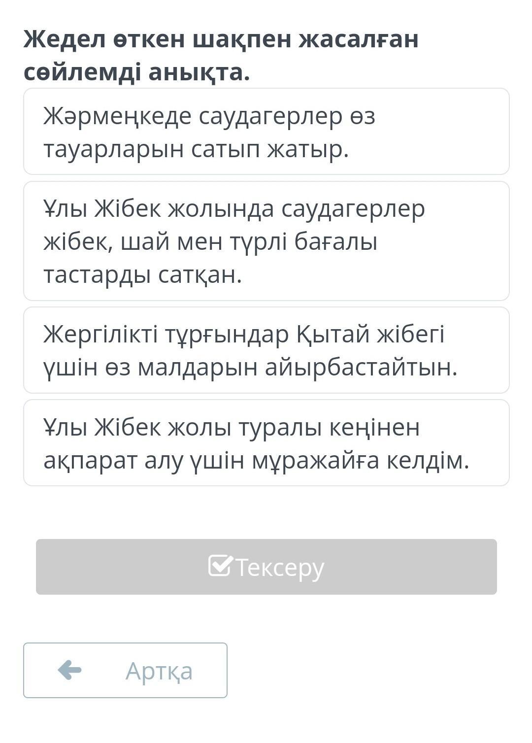 Жібек жолындағы Қазақстан Жедел өткен шақпен жасалған сөйлемді анықта. Жәрмеңкеде саудагерлер өз тауарларын сатып жатыр. Ұлы Жібек жолында саудагерлер жібек, шай мен түрлі бағалы тастарды сатқан. Жергілікті тұрғындар Қытай жібегі үшін өз малдарын айырбастайтын. Ұлы Жібек жолы туралы кеңінен ақпарат алу үшін мұражайға келдім. Артқа Тексеру
