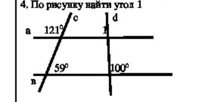 допустим угол, равный 100⁰ будет "2", он (как накрест лежащий при пересечении параллельных прямых а и б секущей d) будет равен углу, который находится под углом 1, пусть это будет угол "3", из этого выходит, что угол "3" равен углу, находящемуся справа от угла 1(как вертикальный). Мы знаем (из книги), что угол 1 + угол "3" = 180, значит, угол 1=180-100.