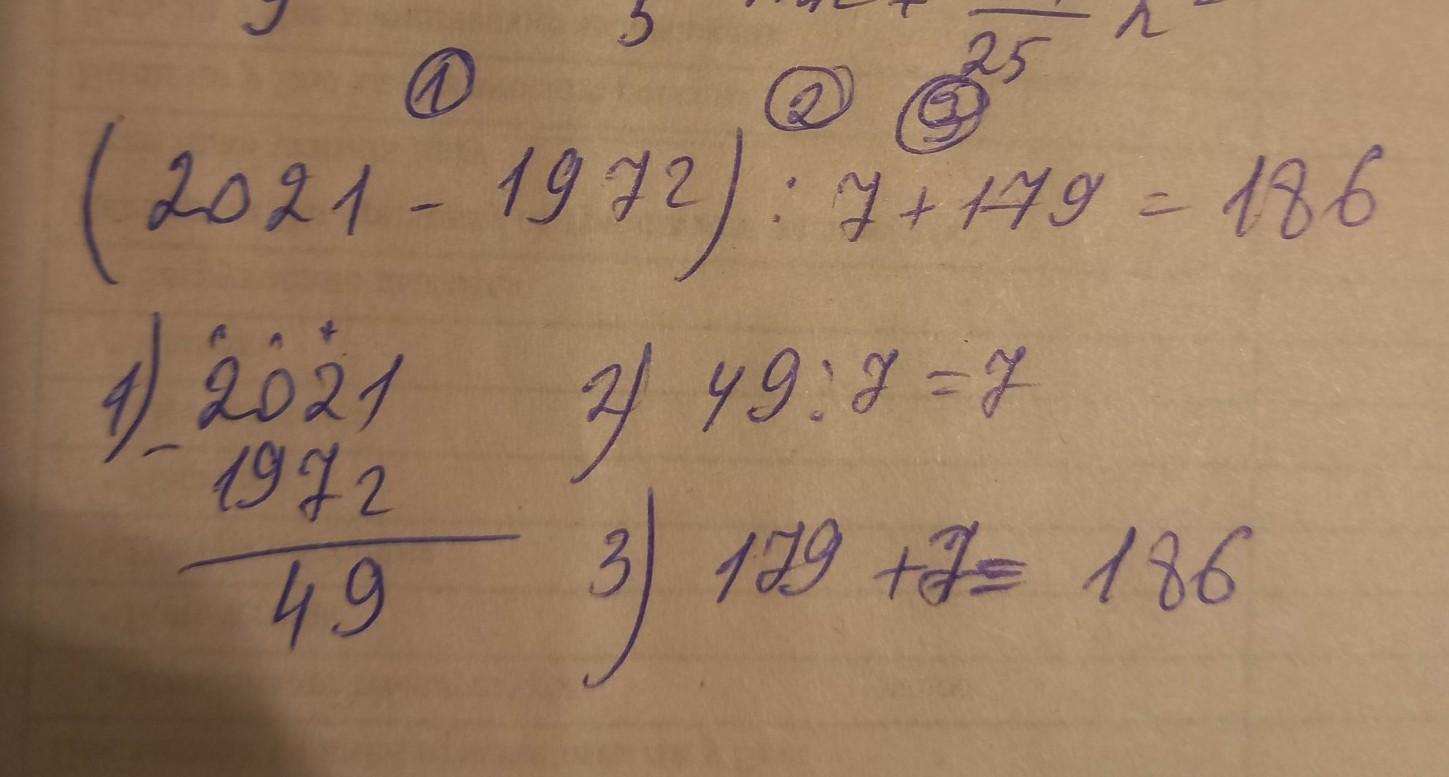 1 Найди значение выражения (2021 – 1972) : 7 + 179. Ответ: