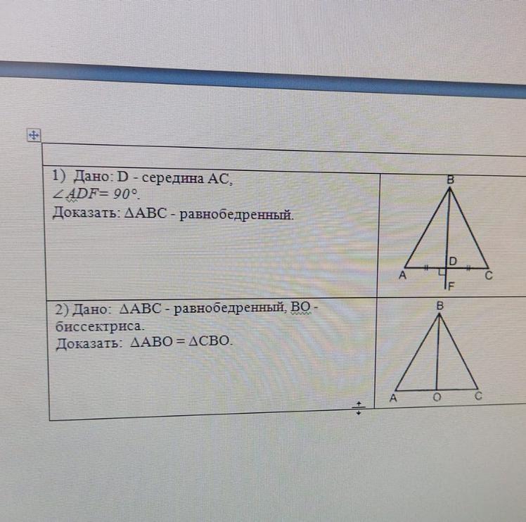 треугольник ADB равен треугольнику CDB по катетам AF, FC и общему катету BD . (равенство прямоугольных треугольников)следовательно равны AB, BC как соответственные элементы равных треугольников.