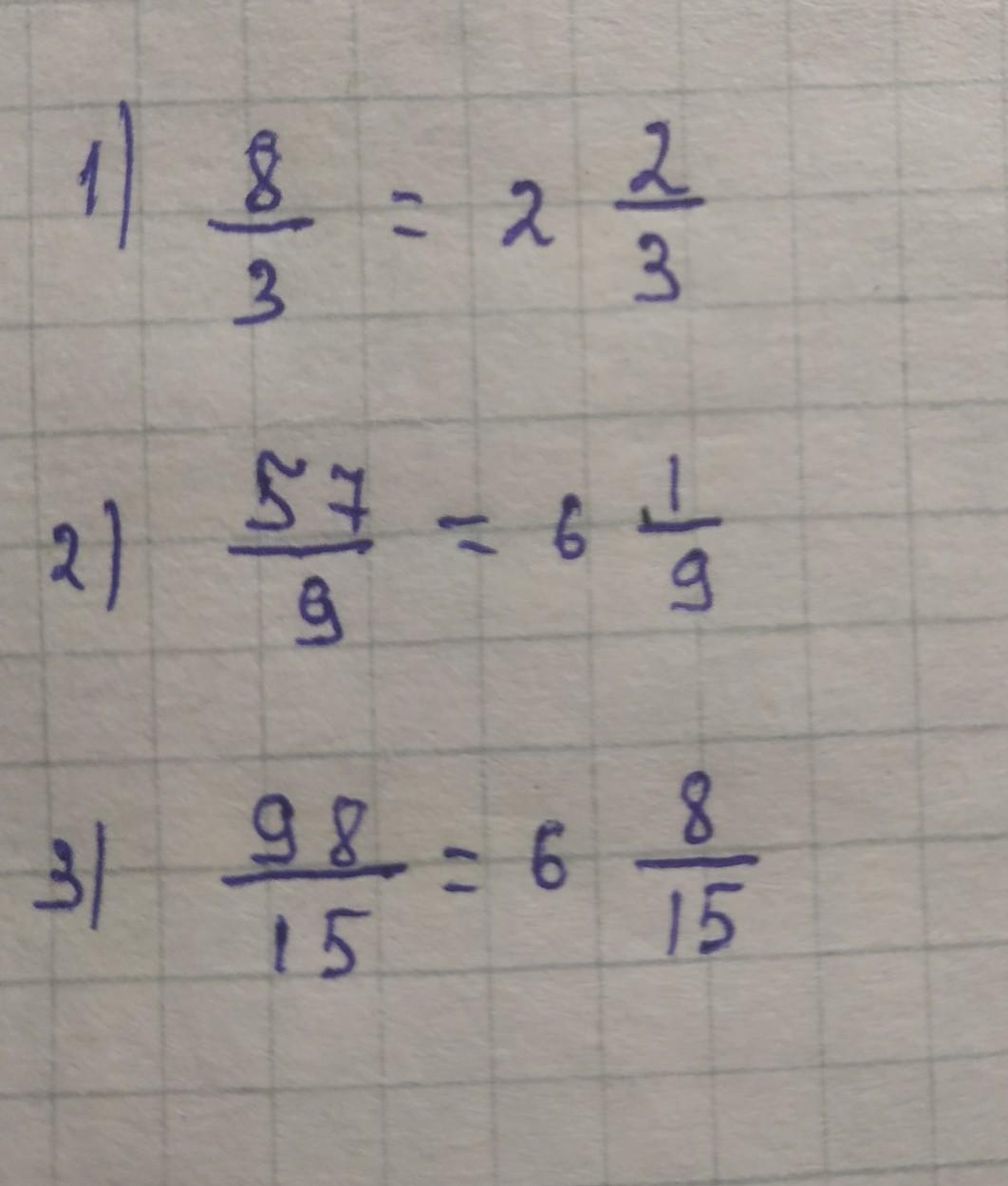Запишiть частку у вигляді дробу і виділіть з отриманого дробу цилу і дробову частини:8:3 57;9 98:15