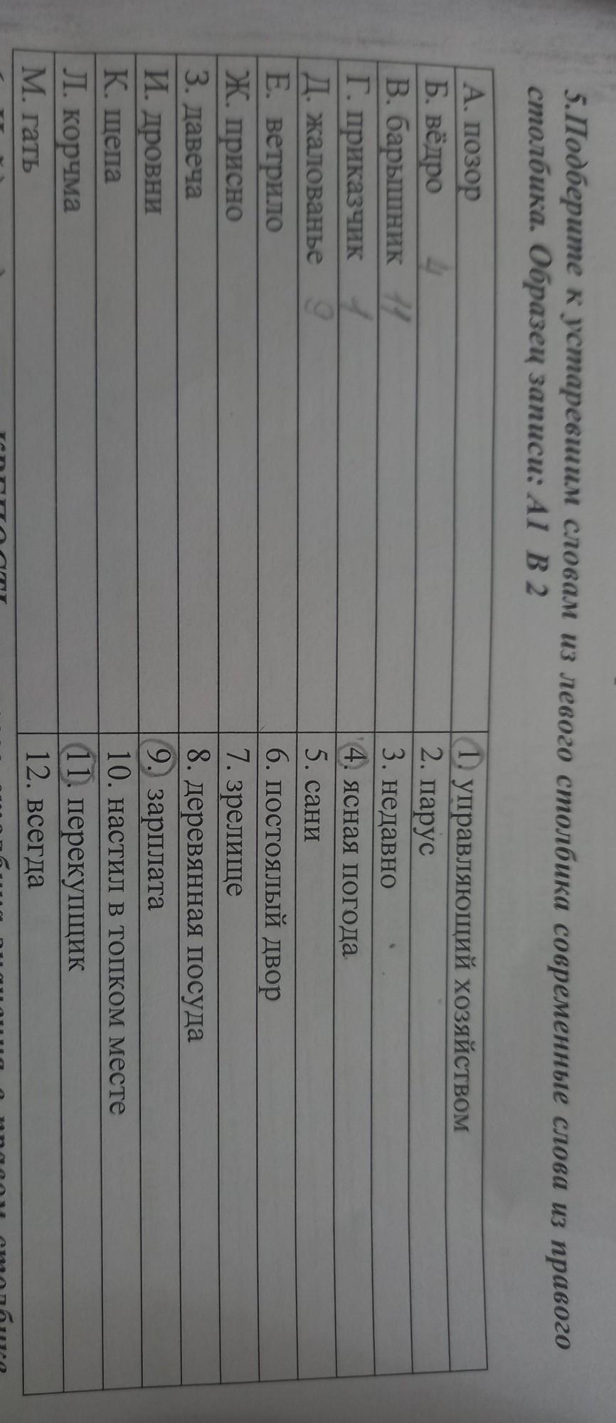 Подберите к устаревшим словам из левого столбика современные слова из правого столбика