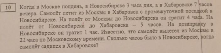 на весь полет он потратил 4+5+1=10 часов. если из москвы он вылетел в 22, то прилетел в 8 утра по московскому, а по новосиб. это 11 утра