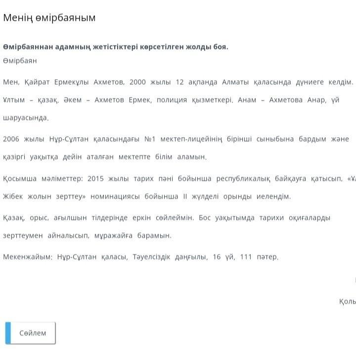 Менің өмірбаяным Өмірбаяннан адамның жетістіктері көрсетілген жолды боя. Өмірбаян Мен, Қайрат Ермекұлы Ахметов, 2000 жылы 12 ақпанда Алматы қаласында дүниеге келдім. Ұлтым – қазақ. Әкем – Ахметов Ермек, полиция қызметкері. Анам – Ахметова Анар, үй шаруасында. 2006 жылы Нұр-Сұлтан қаласындағы №1 мектеп-лицейінің бірінші сыныбына бардым және қазіргі уақытқа дейін аталған мектепте білім аламын. Қосымша мәліметтер: 2015 жылы тарих пәні бойынша республикалық байқауға қатысып, «Ұлы Жібек жолын зерттеу» номинациясы бойынша ІІ жүлделі орынды иелендім. Қазақ, орыс, ағылшын тілдерінде еркін ПОМОГИТЕ ПРОШУ