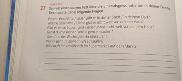 Nicht weit von unserem Haus gibt es einen Markt. Es gibt auch einen Supermarkt im Zentrum der Stadt. Ein paar Mal pro Woche gehen meine Familie und ich in einen dieser Läden einkaufen. Normalerweise kaufen wir nur das Nötigste: Eier, Käse, Gemüse, Obst.