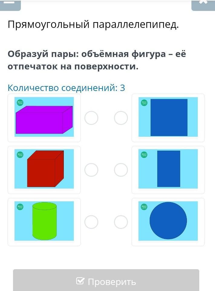 Прямоугольный параллелепипед. Образуй пары: объёмная фигура – её отпечаток на поверхности. Количество соединений: 3