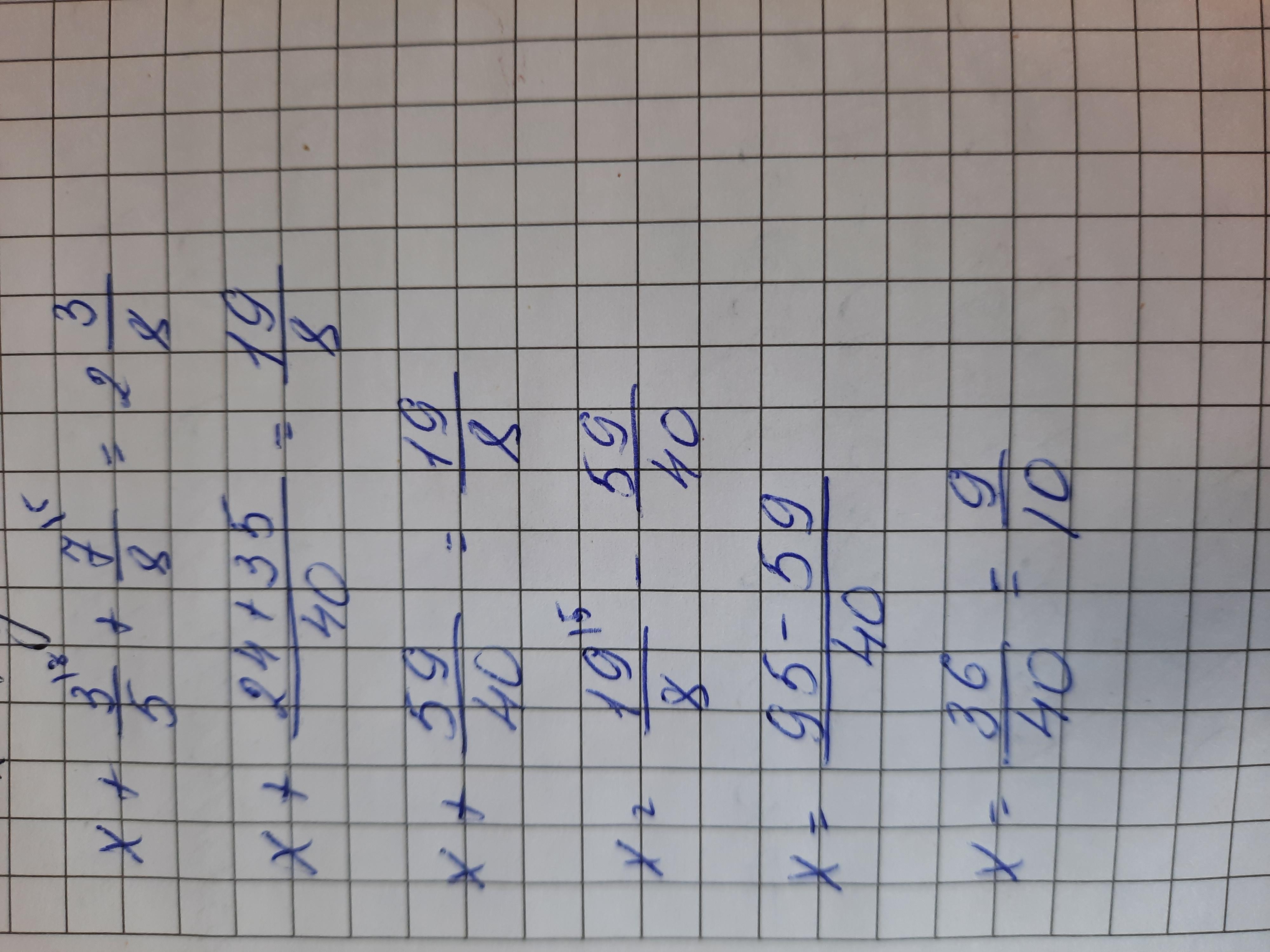 Х+3/5+7/8=х+6/10+8,75/10=х+14,75/10=2 3/8 или х+1,475=2,375 или х=2,375-1,475=0,9.