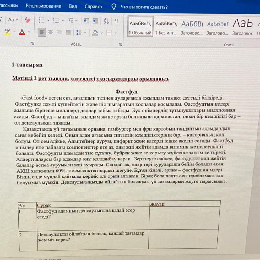 1) Фастфуд денсаулыққа өте зиян. Ол жаман әсер етеді, көп калориялар, инфаркт және қатерлі ісікке әкеліп соғады. 2)Денсаулықты ойлайтын болса, пайдалы тағамдар жеуміз керек. Мысалы: көкөністер, жемістер, жаңғақтар және т.б.