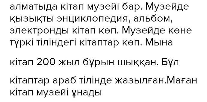 Музейде қызықты Маған кітап музейі ұнады. оқылым 3-тапсырма. Оқы. Сөйлемдерді мәтін мазмұны бойынша орналастыр. Маған кітап музейі ұнады. Мына кітап екі жүз жыл бұрын шыққан. Бұл кітаптар араб тілінде жазылған. Музейде көне түркі тіліндегі кітаптар бар. Алматыда кітап музейі бар. Музейде қызықты энциклопедия, альбом, электронды кітап көп. пожалуйста помогите мне пожалуйста