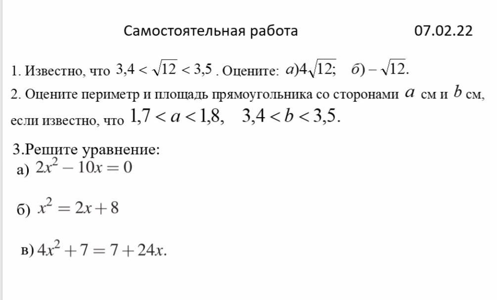 Требуется оценить выражение, оценить площадь и периметр прямоугольника, решить уравнения.