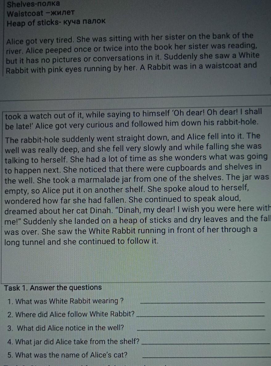 Task 1. Answer the questions 1. What was White Rabbit wearing ? 2. Where did Alice follow White Rabbit? 3. What did Alice notice in the well? 4. What jar did Alice take from the shelf? 5. What was the name of Alice's cat?