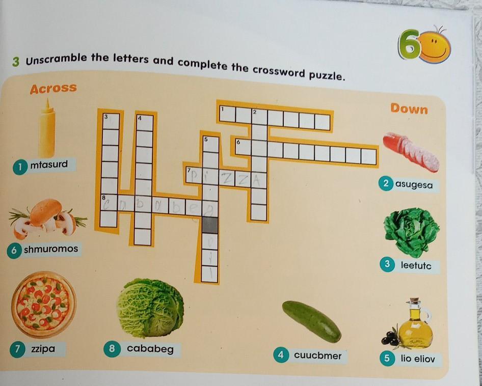 3 Unscramble the letters and complete the crossword puzzle. Across Down mtasurd 2 asugeso 6 shmuromos 3 leetute 7 zzipa 8 cababeg 4 cuucbmer 5 lio elior