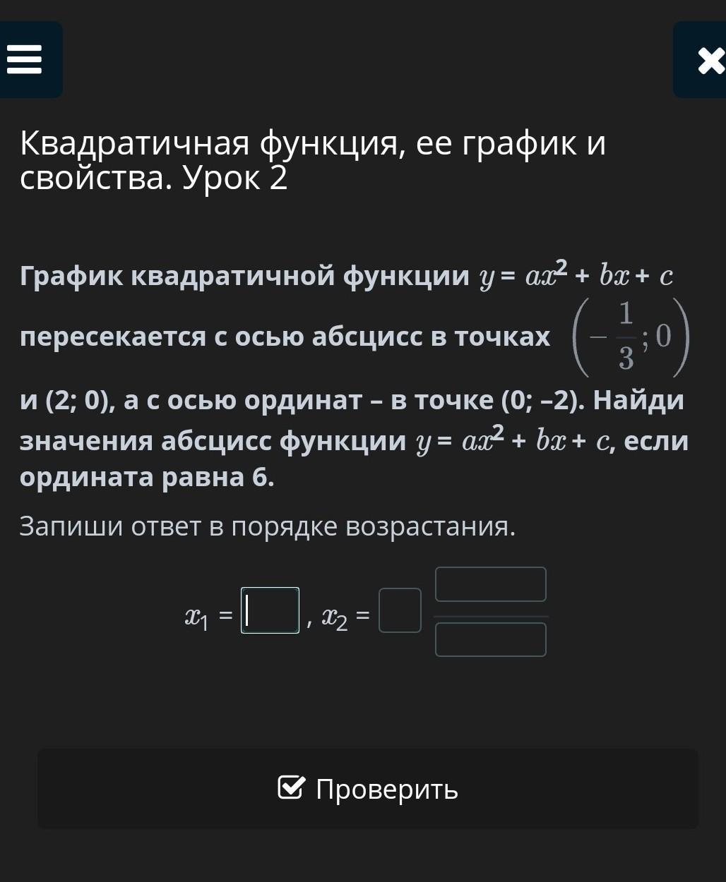 квадратичной функции y = ax2 + bx + c пересекается с осью абсцисс в точках и (2; 0), а с осью ординат – в точке (0; –2). Найди значения абсцисс функции y = ax2 + bx + c, если ордината равна 6. Запиши ответ в порядке возрастания. x1 =, x2 =