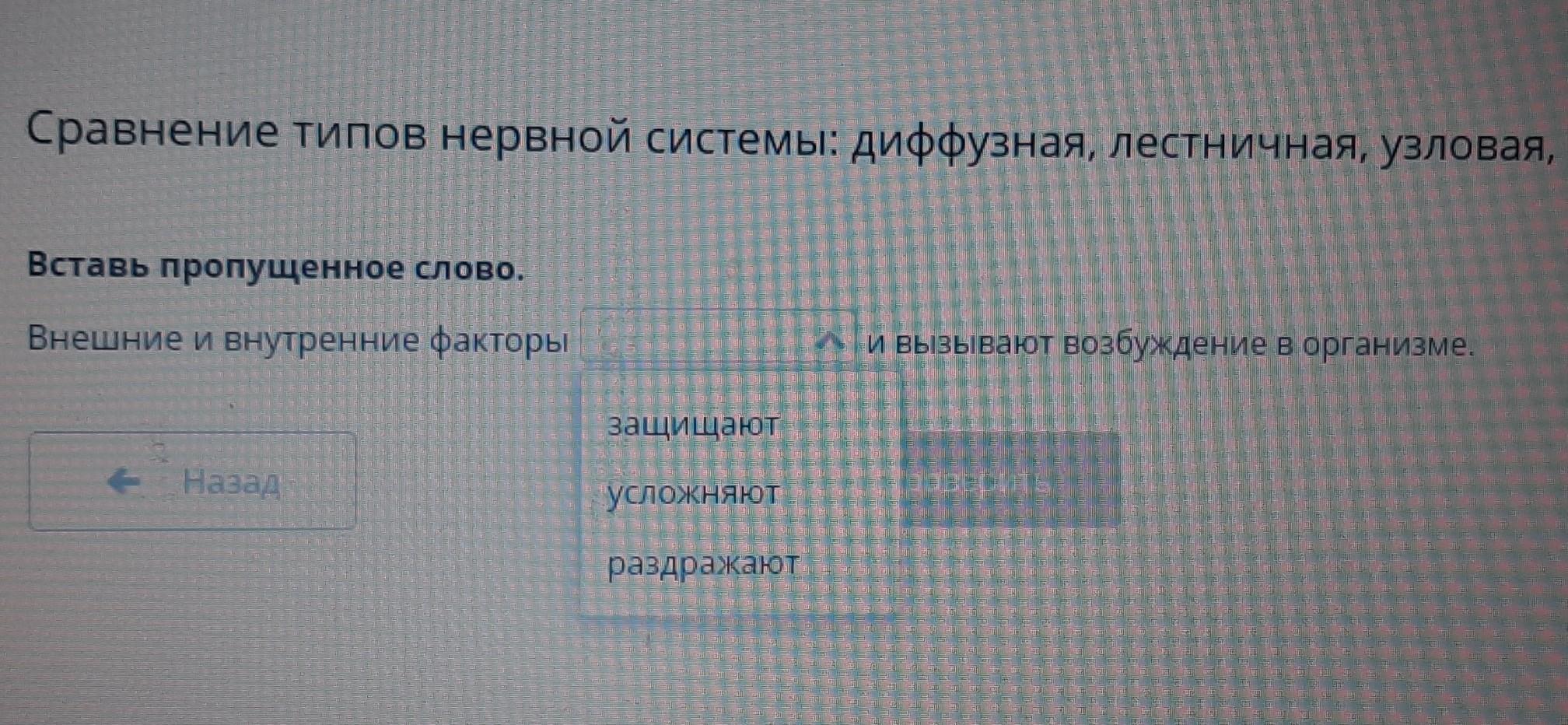 Сравнение типов нервной системы: диффузная, лестничная, узловая, трубчатая Вставь пропущенное слово. (я уже сделала,там будет "раздражают")
