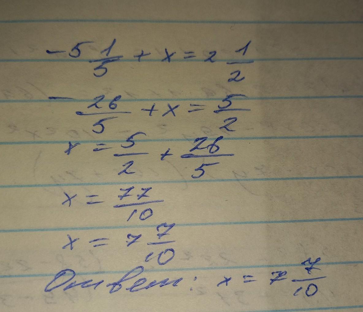 решите уравнение -5 1\5+х=2 1\2 у меня тест который на два дня но это не всё