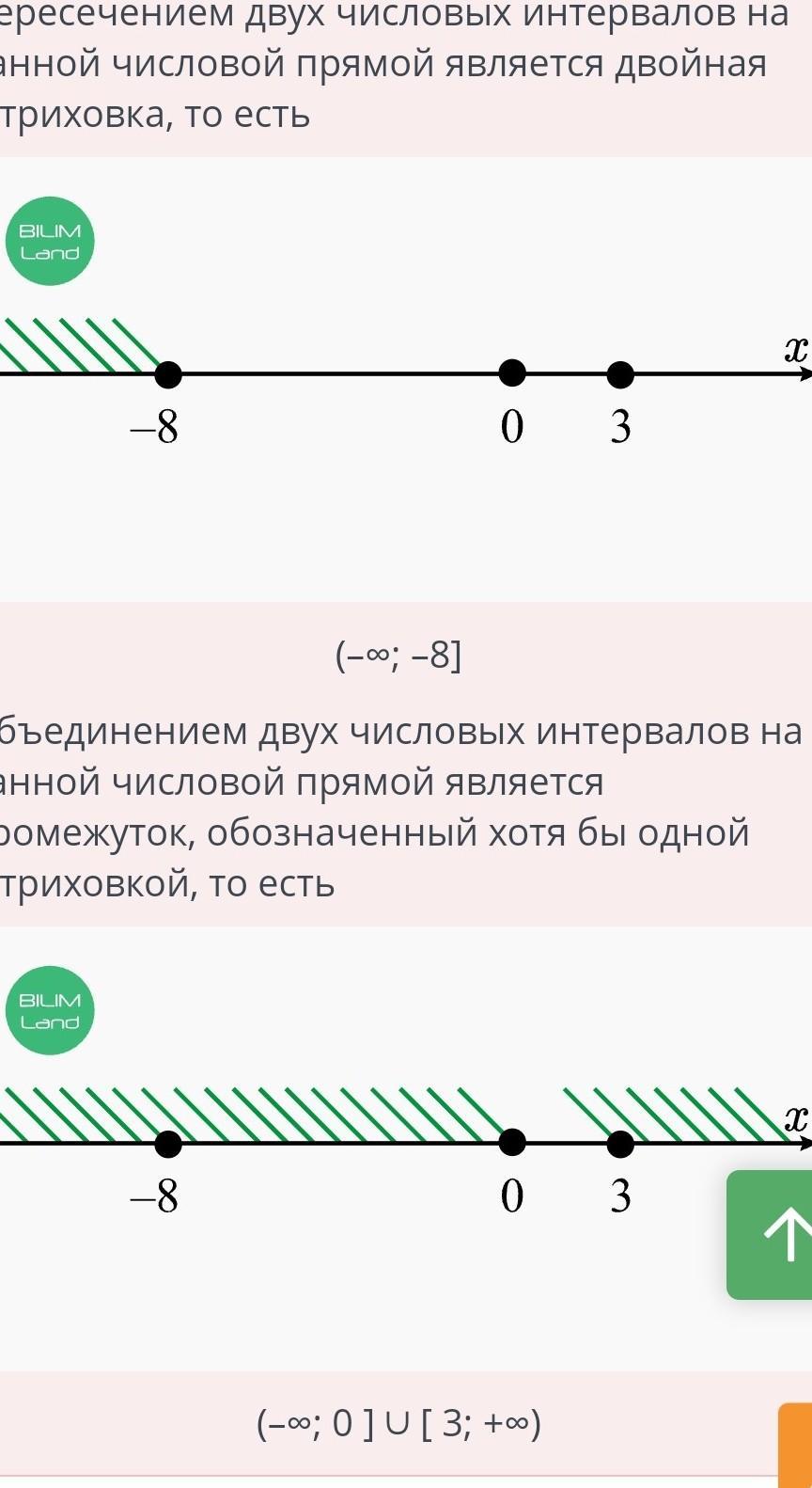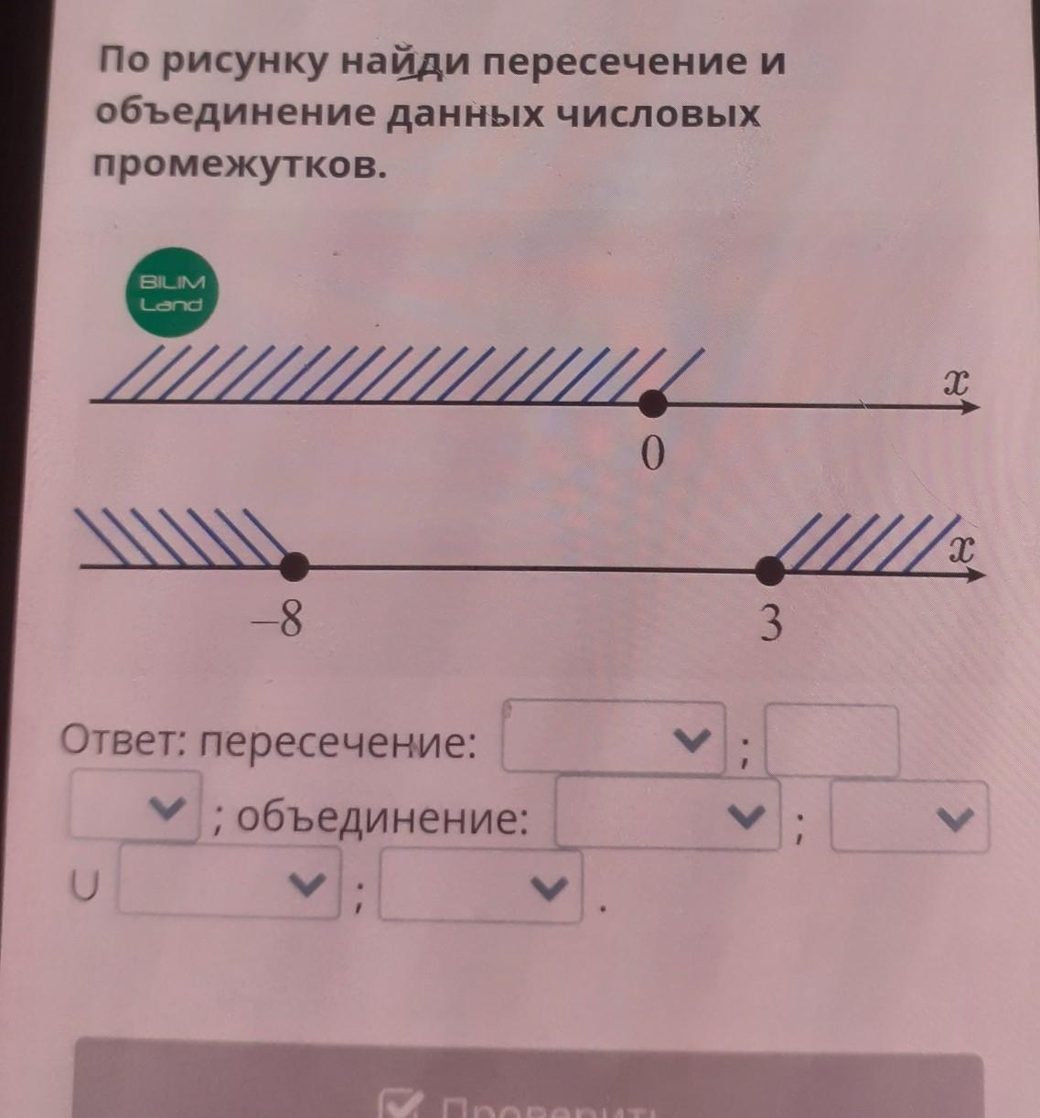 По рисунку найди пересечение и объединение данных числовых промежутков. BILIM Land т 0 х -8 3 Ответ: пересечение: ; объединение: V ul