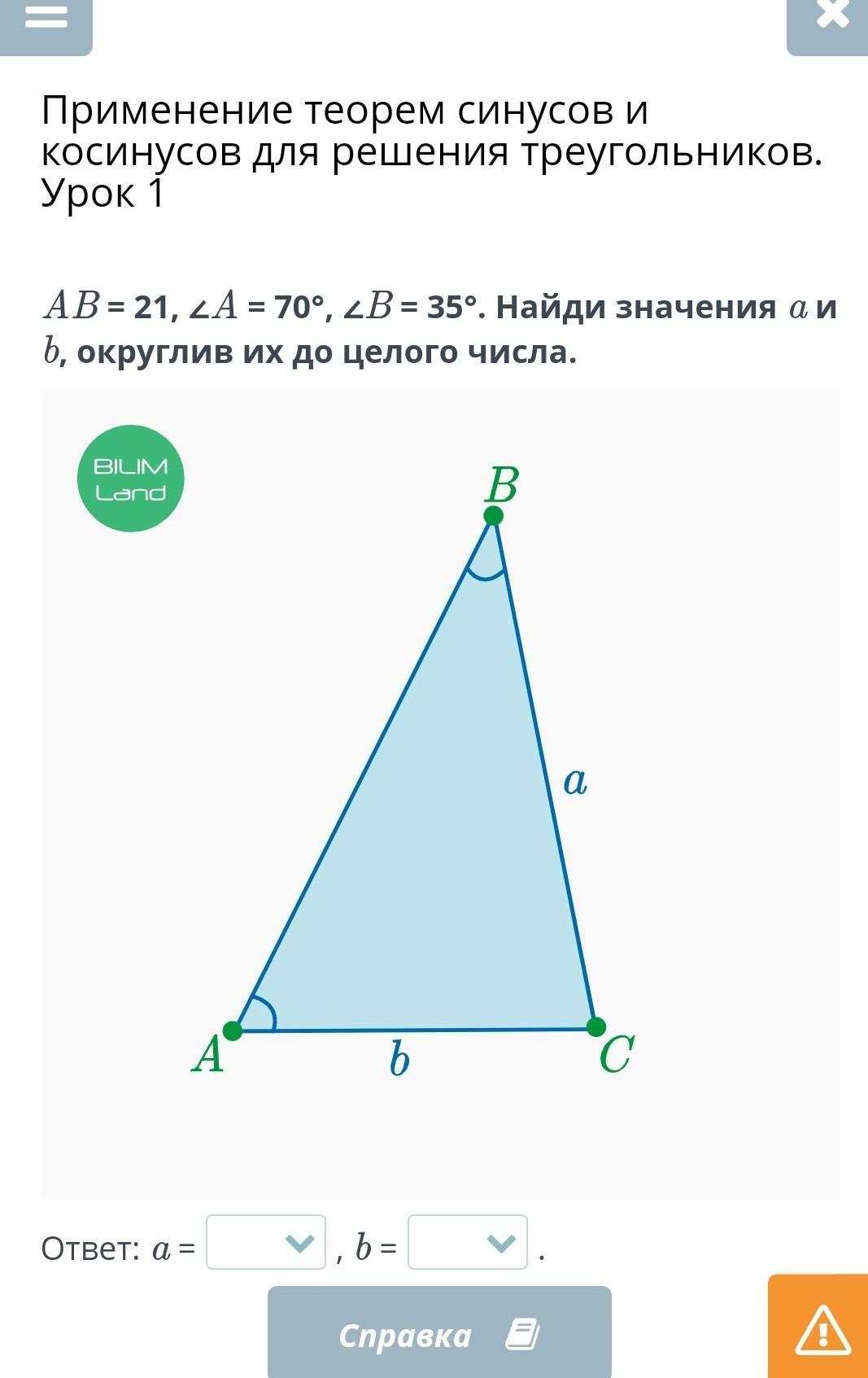 AB = 21, LA = 70°, <B = 35°. Найди значения а и ь, округлив их до целого числа.