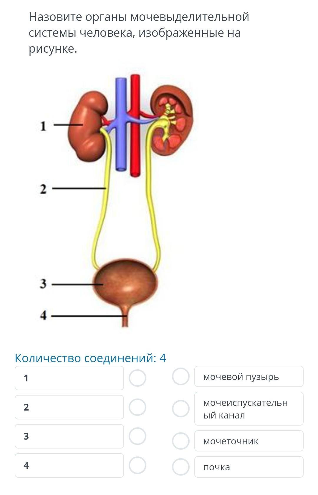 Назовите органы мочевыделительной системы человека, изображенные на рисунке. 1 а) 2 3 Количество соединений: 4 1 мочевой пузырь 2. мочеиспускательн ый канал 3 мочеточник 4 почка
