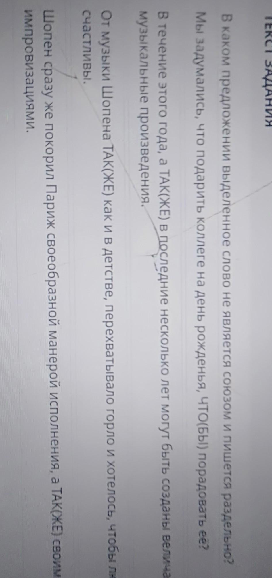 ТЕКСТ ЗАДАНИЯ В каком предложении выделенное слово не является союзом и пишется раздельно? Мы задумались, что подарить коллеге на день рожденья, ЧТОБЫ) порадовать её? В течение этого года, а ТАКЖЕ) в последние несколько лет могут быть созданы величайшие музыкальные произведения. От музыки Шопена ТАКОЖЕ) как и в детстве, перехватывало горло и хотелось, чтобы люди были счастливы. Шопен сразу же покорил Париж своеобразной манерой исполнения, а ТАКОЖЕ) своими гениальными импровизациями.