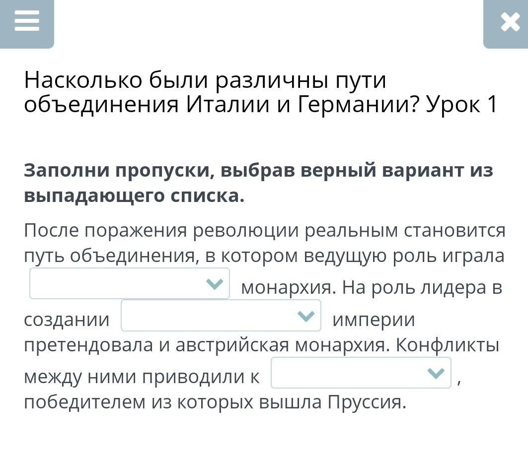 Насколько были различны пути объединения Италии и Германии? Урок 1 Заполни пропуски, выбрав верный вариант из выпадающего списка.