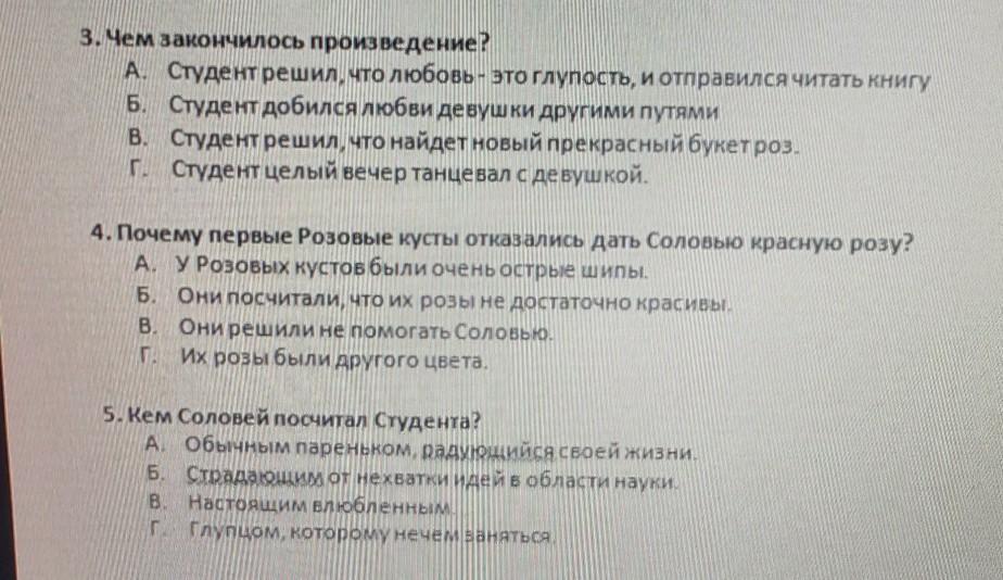 чем закончилось произведение? А. Студент решил, что любовь - это глупость, и отправился читать книгу Б. Студент добился любви девушки другими путями В. Студент решил, что найдет новый прекрасный букет роз. г. Студент целый вечер танцевал с девушкой.