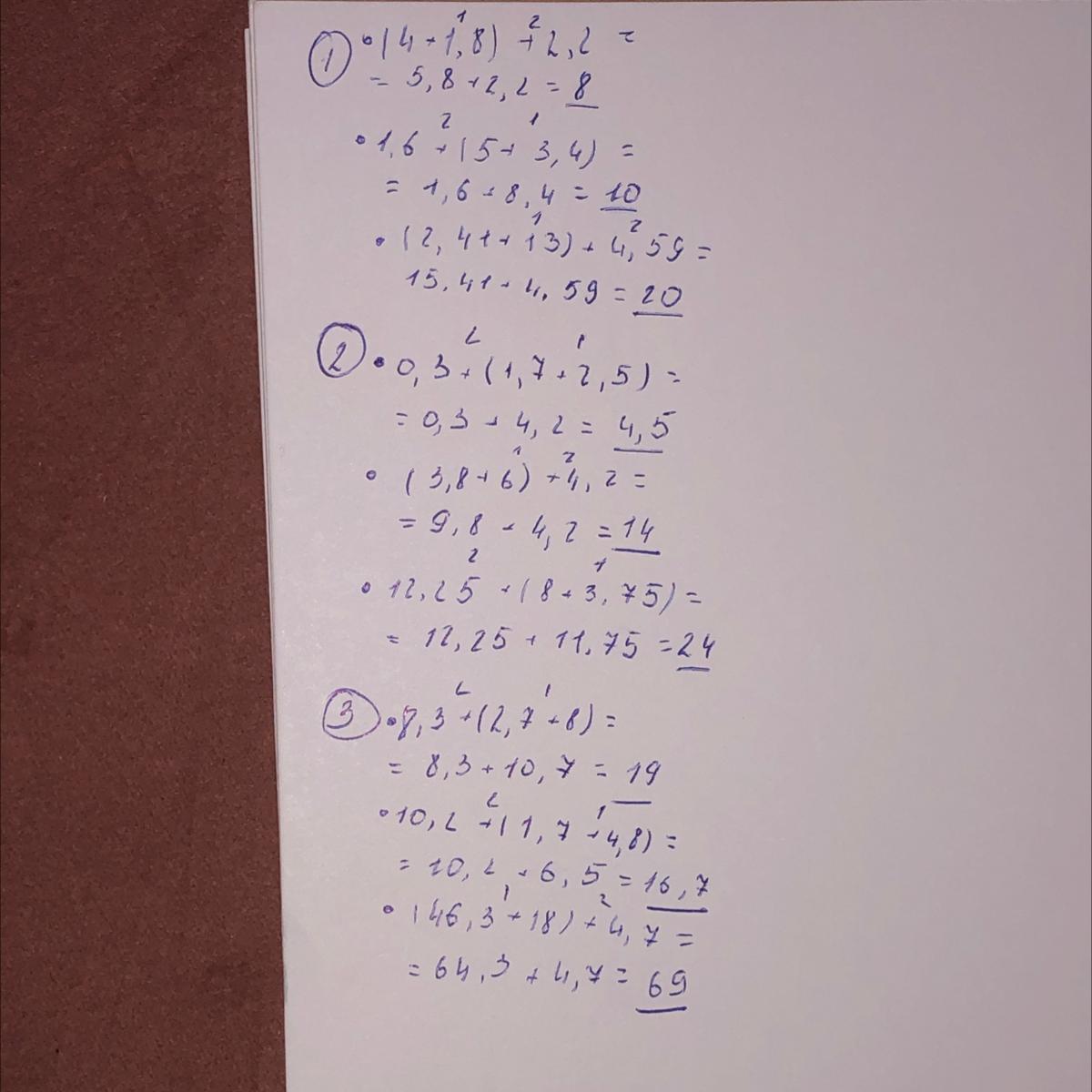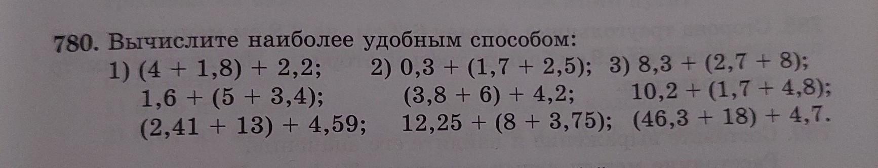 780. Вычислите наиболее удобным способом: 1) (4 + 1,8) + 2,2; 2) 0,3 + (1,7 + 2,5); 3) 8,3 + (2,7 + 8); 1,6 + (5 + 3,4); (3,8 + 6) + 4,2; 10,2 + (1,7 + 4,8); (2,41 + 13) + 4,59; 12,25 + (8 + 3,75); (46,3 + 18) + 4,7.