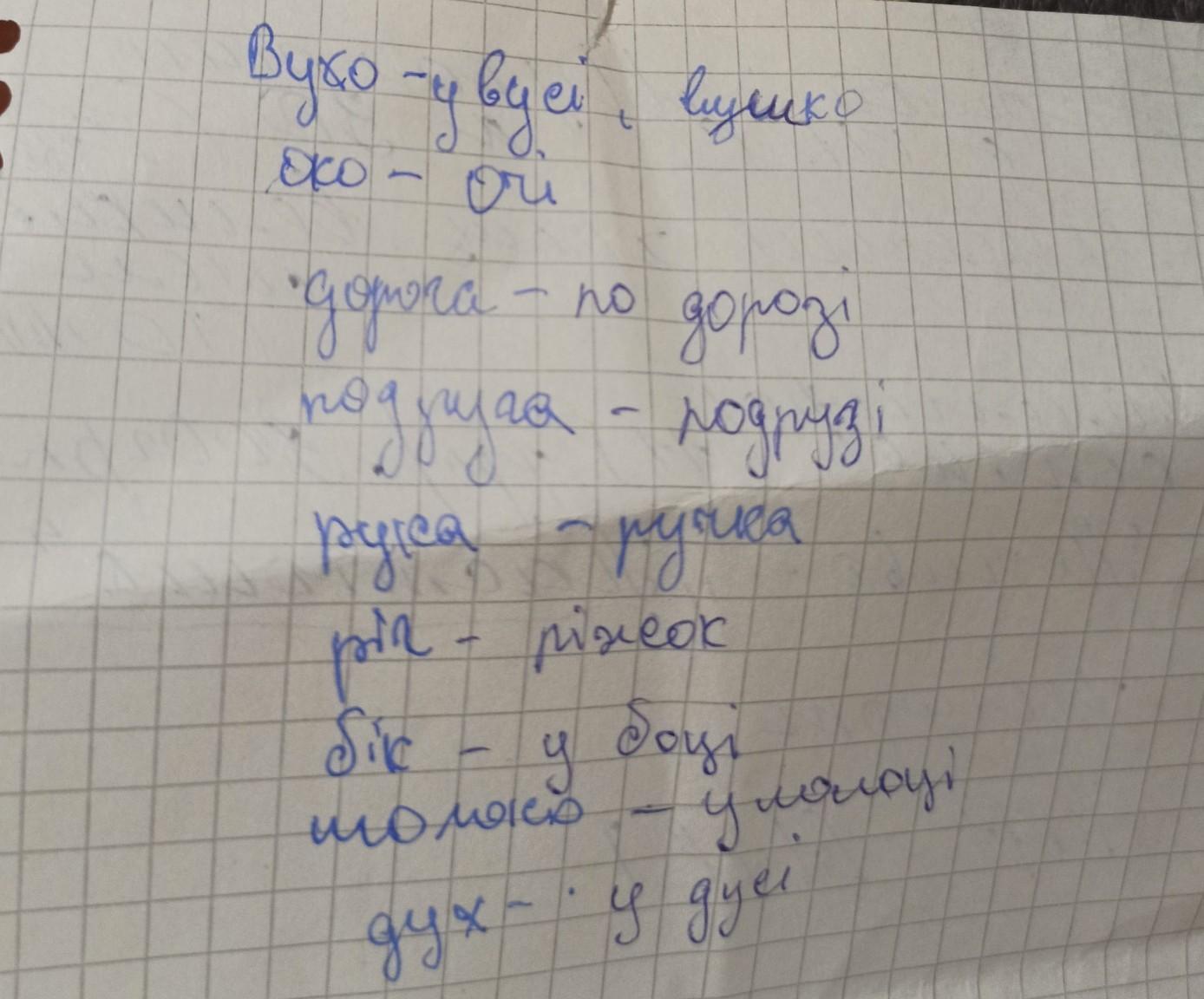 До поданих слів доберіть форми слова або спільнокореневі слова з чергуванням приголосних. Слова запишіть парами. Вухо, око, дорога, подруга, рука, ріг, бік, молоко, дух.