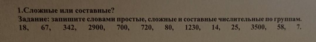 запишите словами простые, сложные и составные числительные по группам. 18, 67, 342, 2900, 700, 720, 80, 1230, 14, 25, 3500, 58, 7. ДАЮ 100 БАЛЛОВ