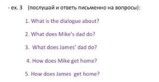 - ex. 3 (послушай и ответь письменно на вопросы): 1. What is the dialogue about? 2. What does Mike's dad do? 3. What does James' dad do? 4. How does Mike get home? 5. How does James get home?