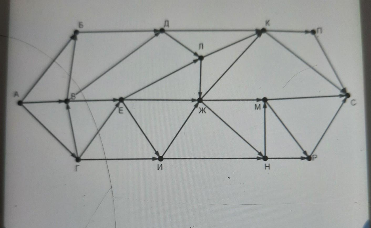 На рисунке представлена схема дорог, связывающих пункты А, Б, В, Г, Д, Е, Ж, И, К, Л, М, Н, П, Р, С. По каждой дороге МОЖНО передвигаться ТОЛЬКО В направлении, указанном стрелкой. Сколько существует различных путей из пункта А в пункт С, проходящих через пункты E и М? Б П А х M И H