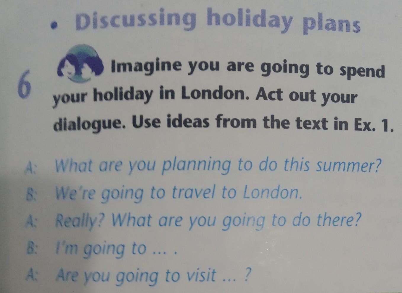 . Discussing holiday plans 6 Imagine you are going to spend your holiday in London. Act out your dialogue. Use ideas from the text in Ex. 1. A: What are you planning to do this summer? B: We're going to travel to London, A: Really? What are you going to do there? B: I'm going to ... . A: Are you going to visit ... ?