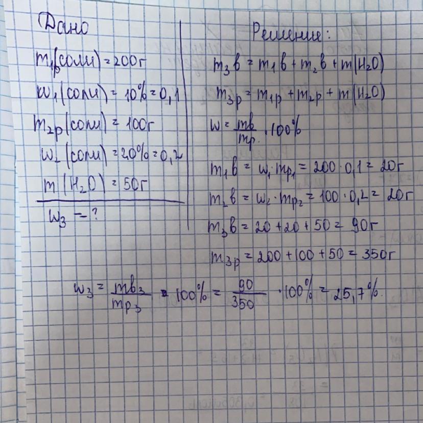 К 200 граммам 10%-ного раствора соли прилили 100 граммов 20%-ного раствора этой же соли и добавили 50 граммов воды. Рассчитать массовую долю соли в полученном растворе. Можно с дано и решением