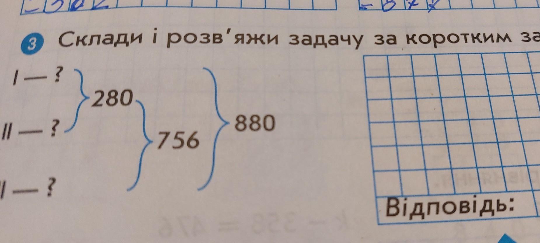 3Склади і розв'яжи задачу за коротким записом. 1 - ? 280 2— ? 880 756 III — ? - - Відповідь: