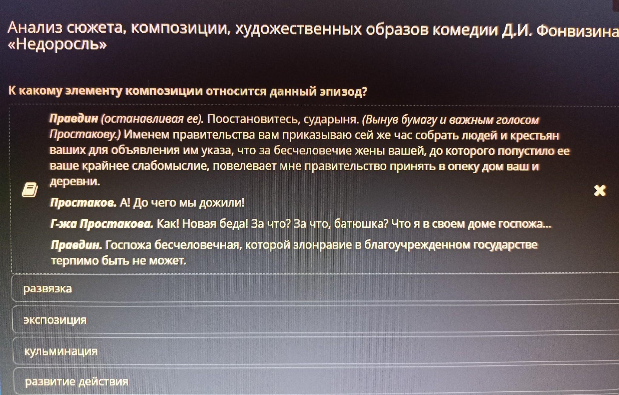 К какому элементу композиции относится данный эпизод? Правдин (останавливая ее). Поостановитесь, сударыня. (Вынув бумагу и важным голос Простакову.) Именем правительства вам приказываю сей же час собрать людей и кре ваших для объявления им указа, что за бесчеловечие жены вашей, до которого попус ваше крайнее слабомыслие, повелевает мне правительство принять в опеку Дом ваш деревни. Простаков. А! До чего мы дожили! Г-жа Простакова. Как! Новая беда! За что? За что, батюшка? Что я в своем доме госпо: Правдин. Госпожа бесчеловечная, которой злонравие в благоучрежденном государств терпимо быть не может. развязка ЭКСПОЗИЦИЯ кульминация развитие действия завязка