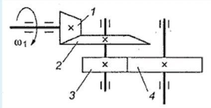 Для изображённой многоступенчатой передачи опреде¬лить общее передаточное число, если d1 = 50 мм; d2 = 200 мм; d3 = 35 мм; d4 = 70 мм.