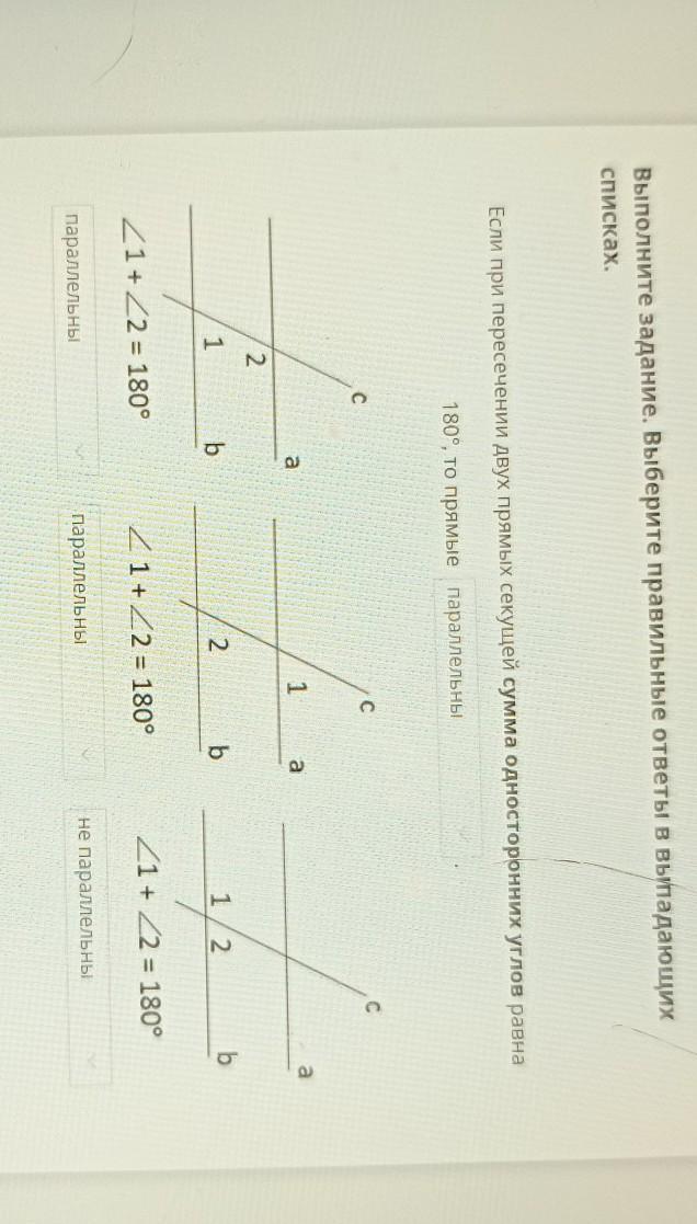 Если при пересечении двух прямых секущей сумма односторонних углов равна 180 градусов то прямые параллельны.