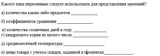б) real вещественные, в) integer целочисленные, г) real вещественные, д) integer целочисленные, е) real вещественные;