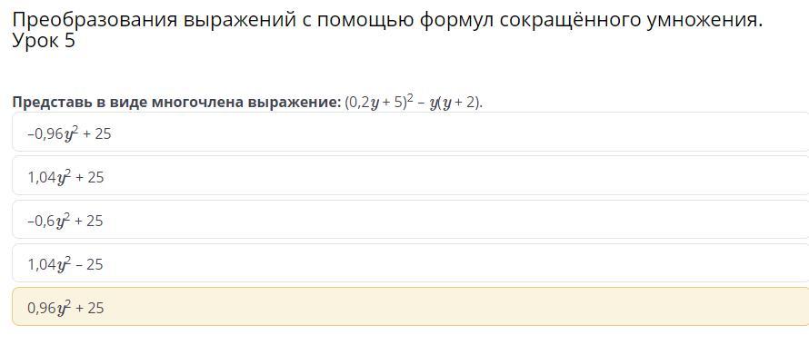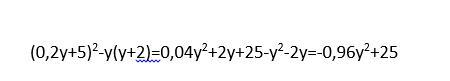 (0,2 у + 5)² - 3(y + 2) = (0,04y² + 2y + 25) - (y² + 2y) = 0,04y² + 2y + 25 - y² - 2y = -0,96y² + 25
